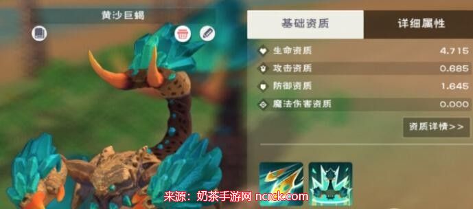 这些资质数据表明,黄沙巨蝎在生命和防御方面有很不错的表现,但在攻击方面相对较弱。