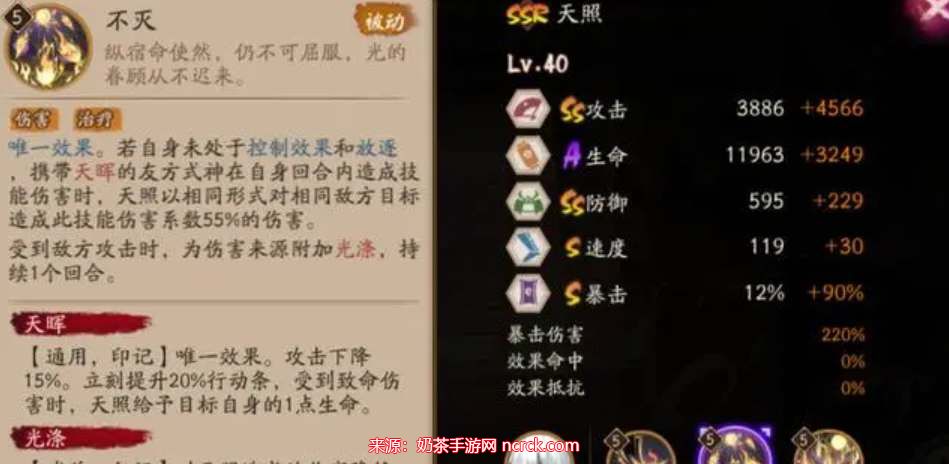在天照大神的面板属性上,防御和攻击均达到了SS级别,综合能力极为出色。