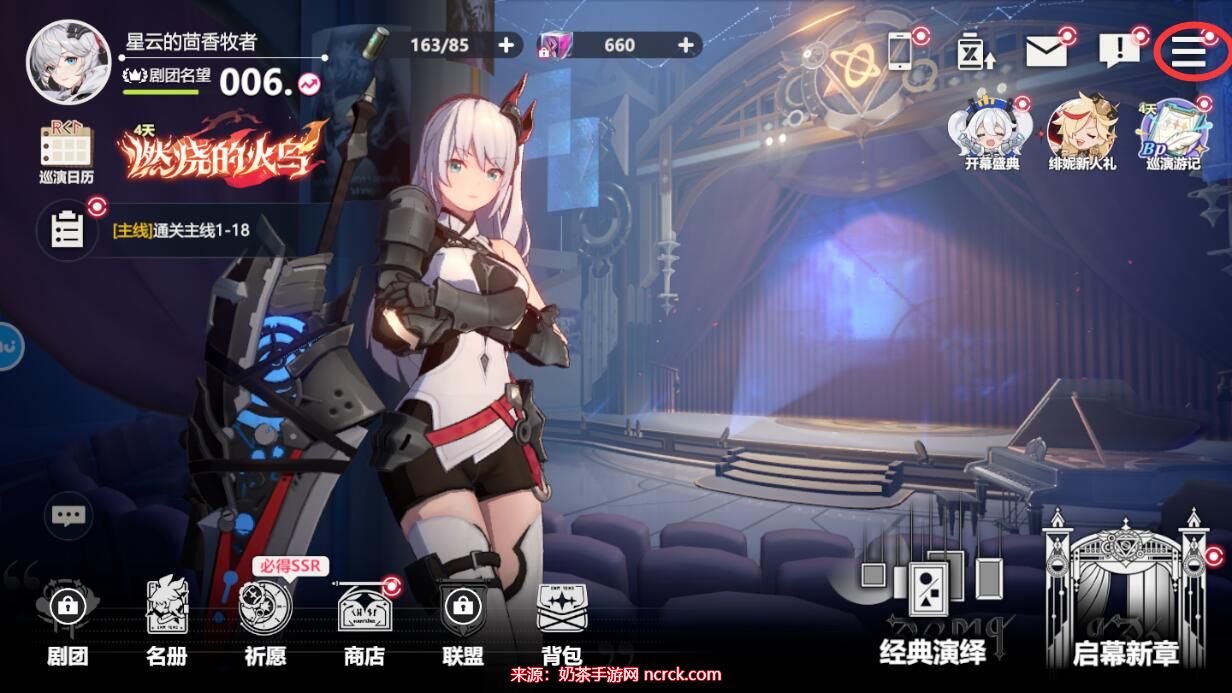 1、完成新手任务后,回到游戏的主界面,点击屏幕右上角的菜单图标,展开一系列操作选项。