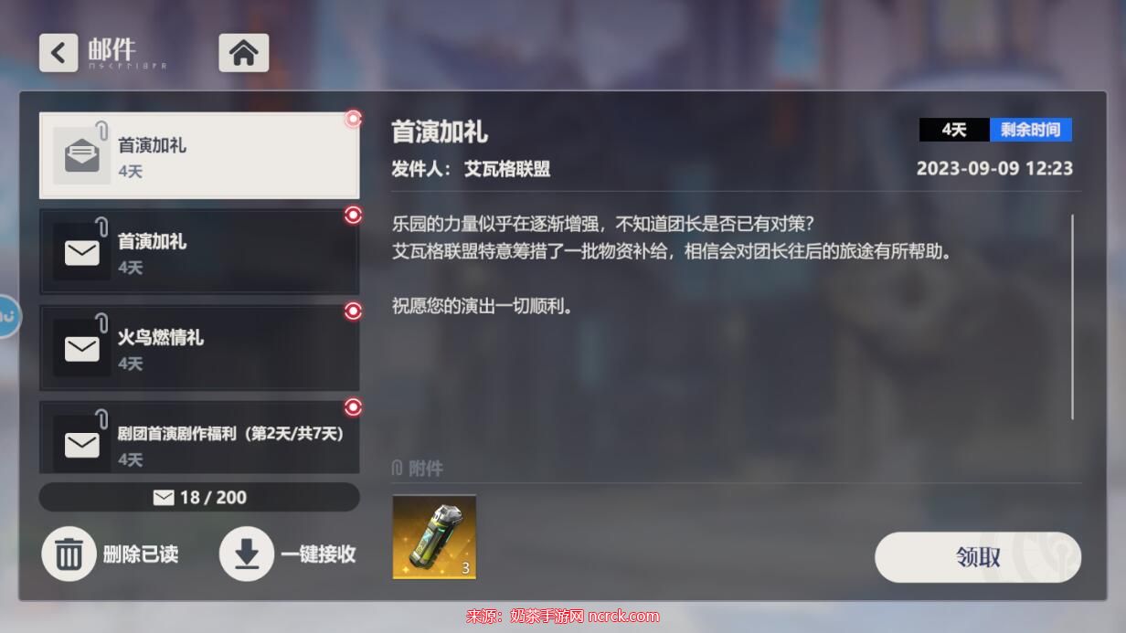 5、完成兑换后,前往游戏内的邮件系统,点击“一键接收”以领取您的奖励。