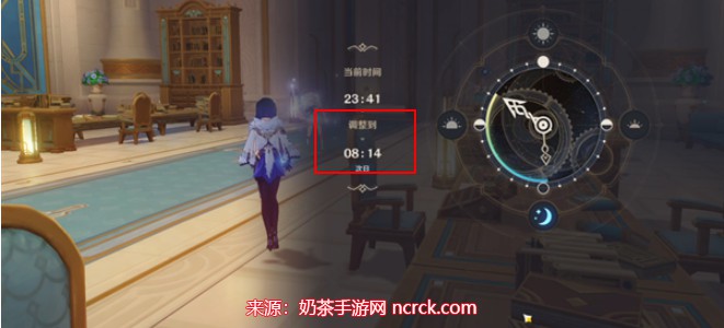 操作:完成与第一个NPC的交互后,调整游戏内的时间至第二天的8点左右。