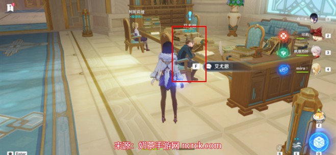 目标:在人群中找到艾友恩NPC,并与之对话。